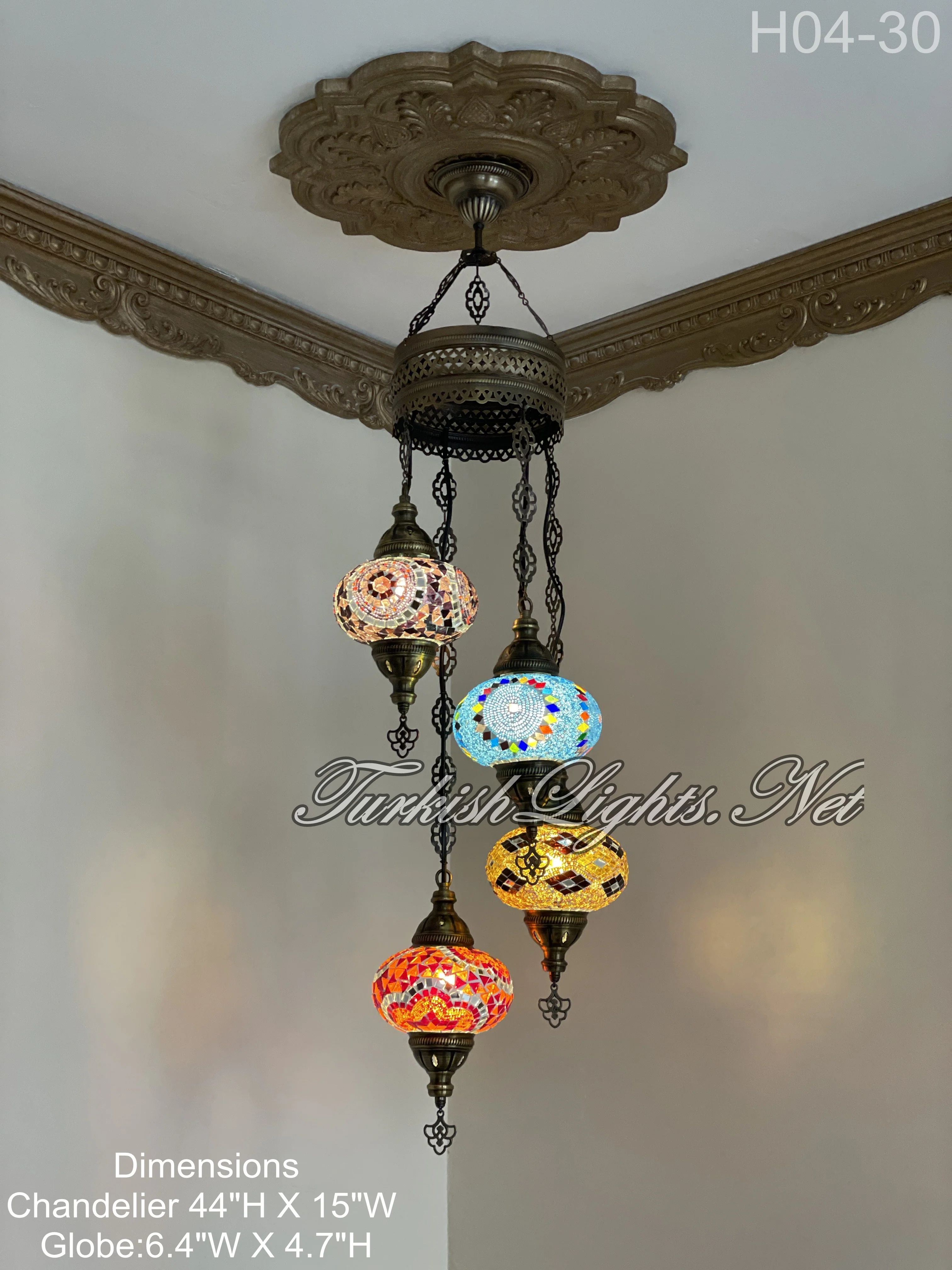 4 Ball Turkish Mosaic Chandelier - Water Drop Design with Large Globes, ID: H04L-30