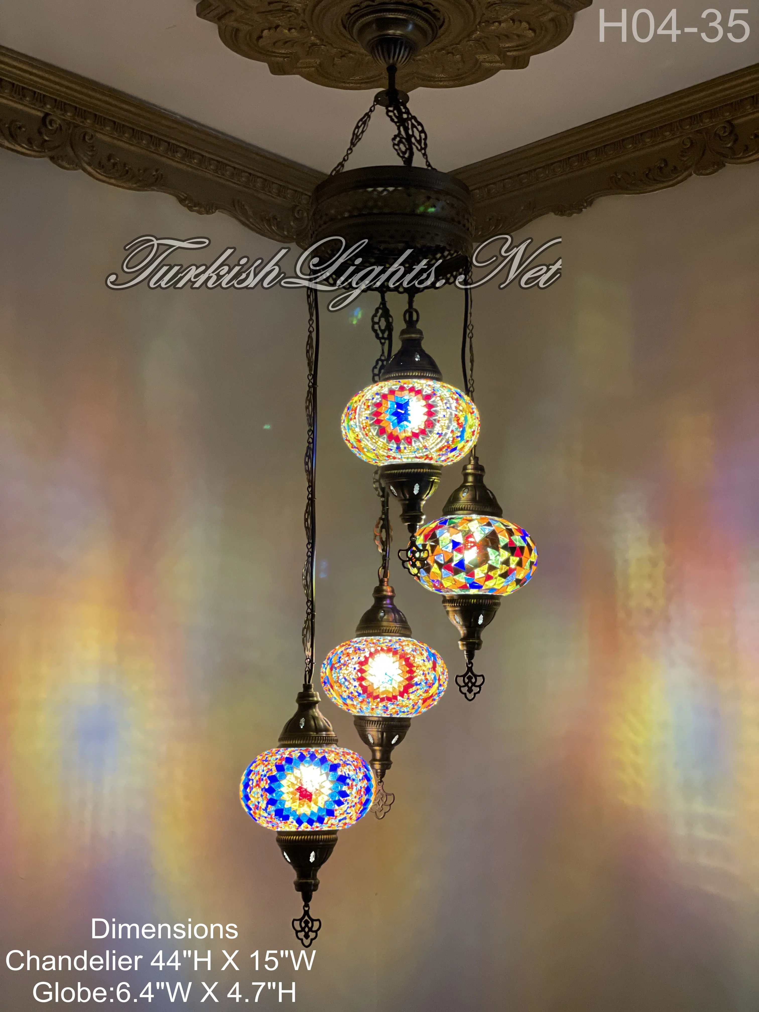 4 Ball Turkish Mosaic Chandelier - Water Drop Design with Large Globes, ID: H04L-35