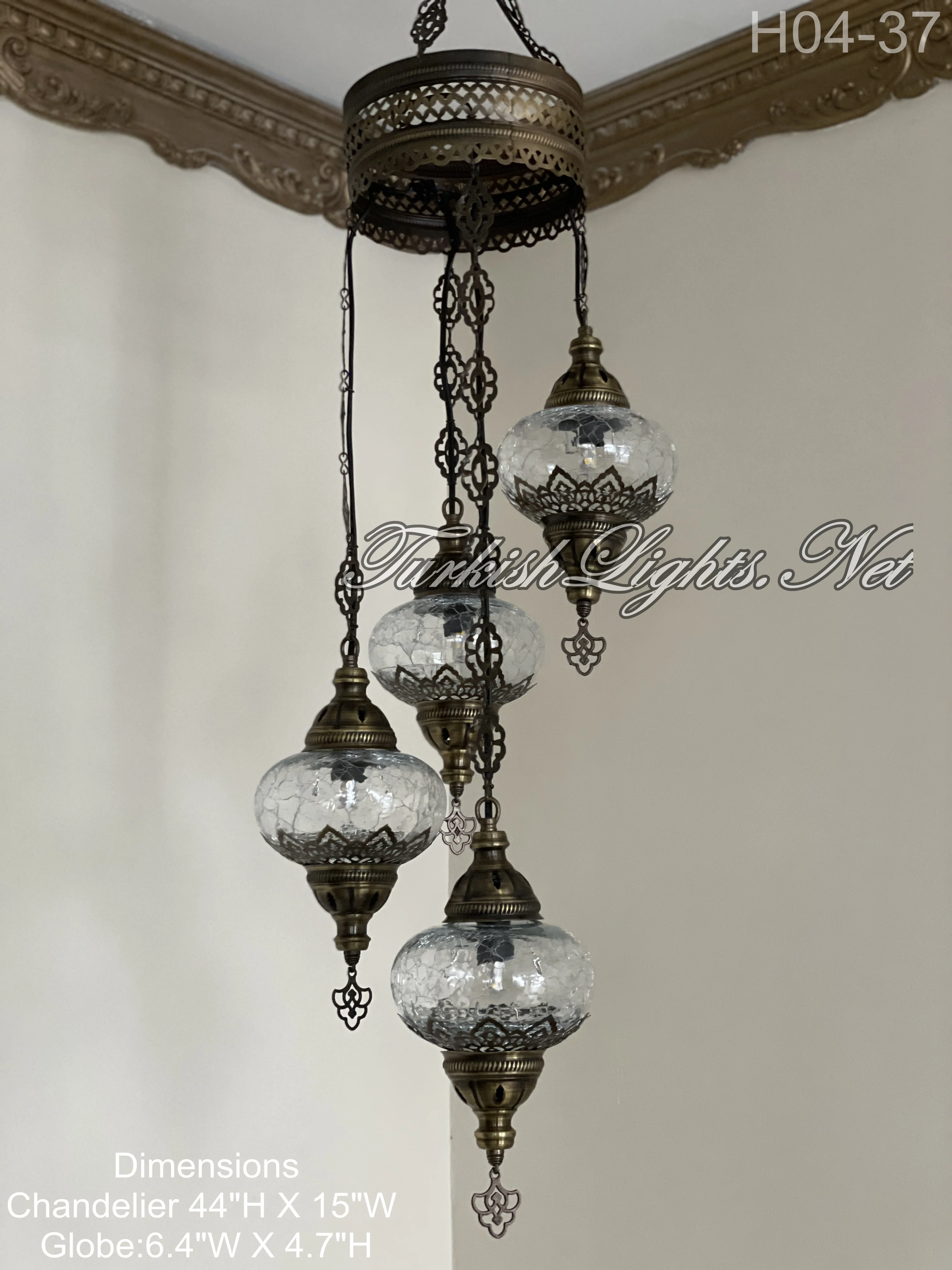 4 Ball Turkish Mosaic Chandelier - Water Drop Design with Large Globes, ID: H04L-37 Clear Cracked Globes