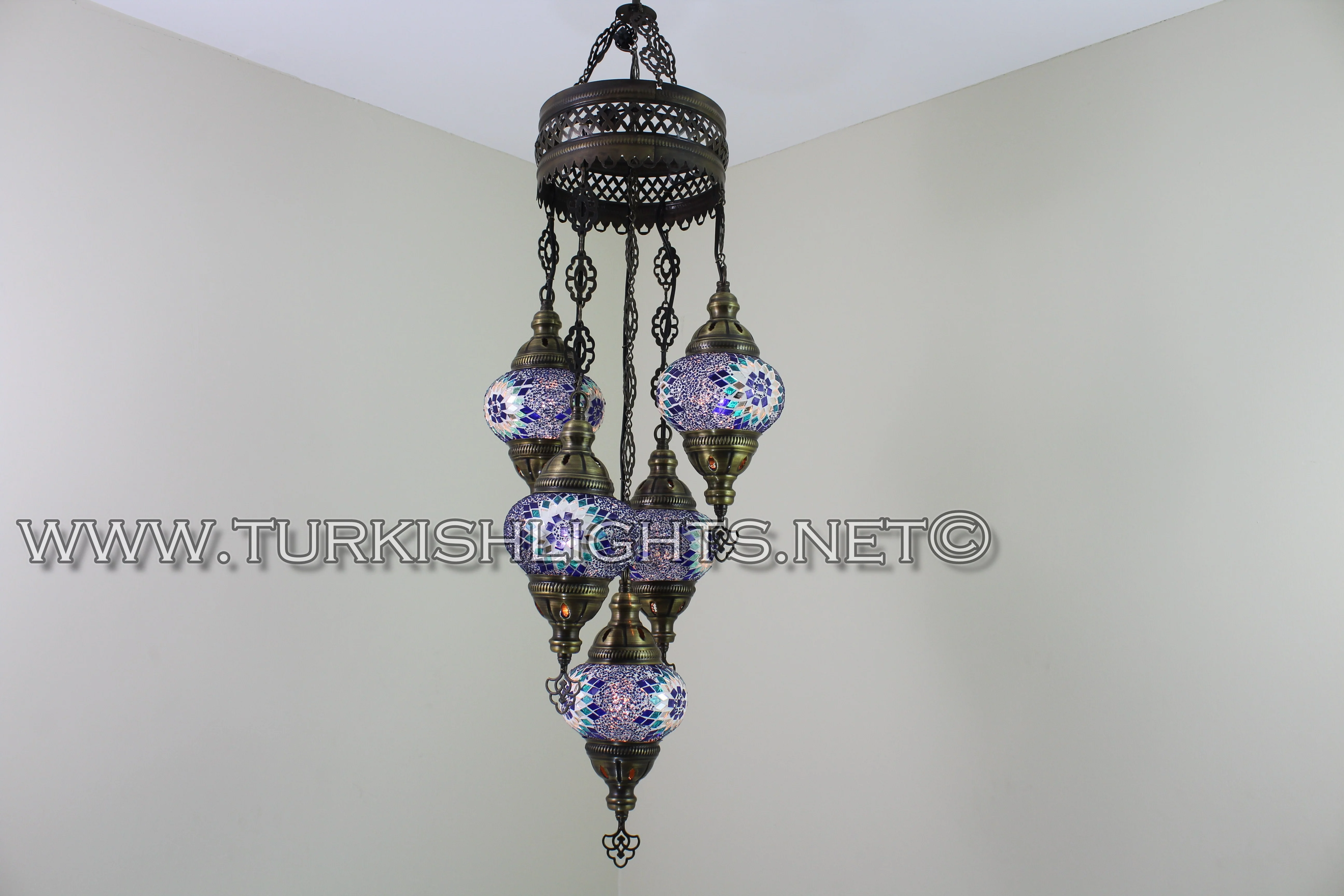 5 Ball Turkish Mosaic Chandelier - Handmade Sultan Design with Large Globes, ID: S5L-11