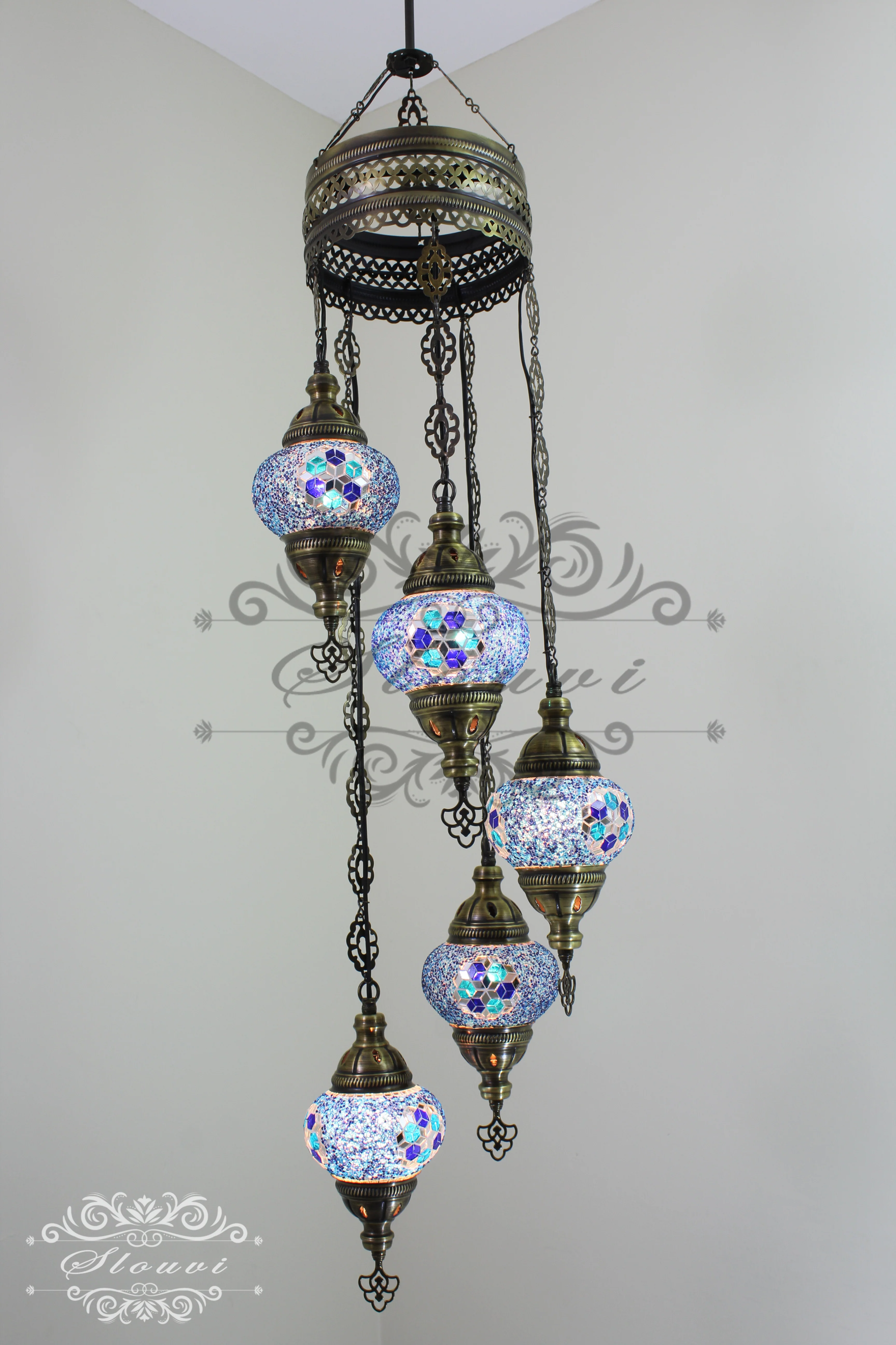 Experience the timeless elegance of Ottoman craftsmanship with this stunning 5-ball Turkish Water Drop mosaic chandelier. Each piece is meticulously handmade by skilled Turkish artisans, featuring authentic mosaic glass globes in medium size with an elegant water drop design.