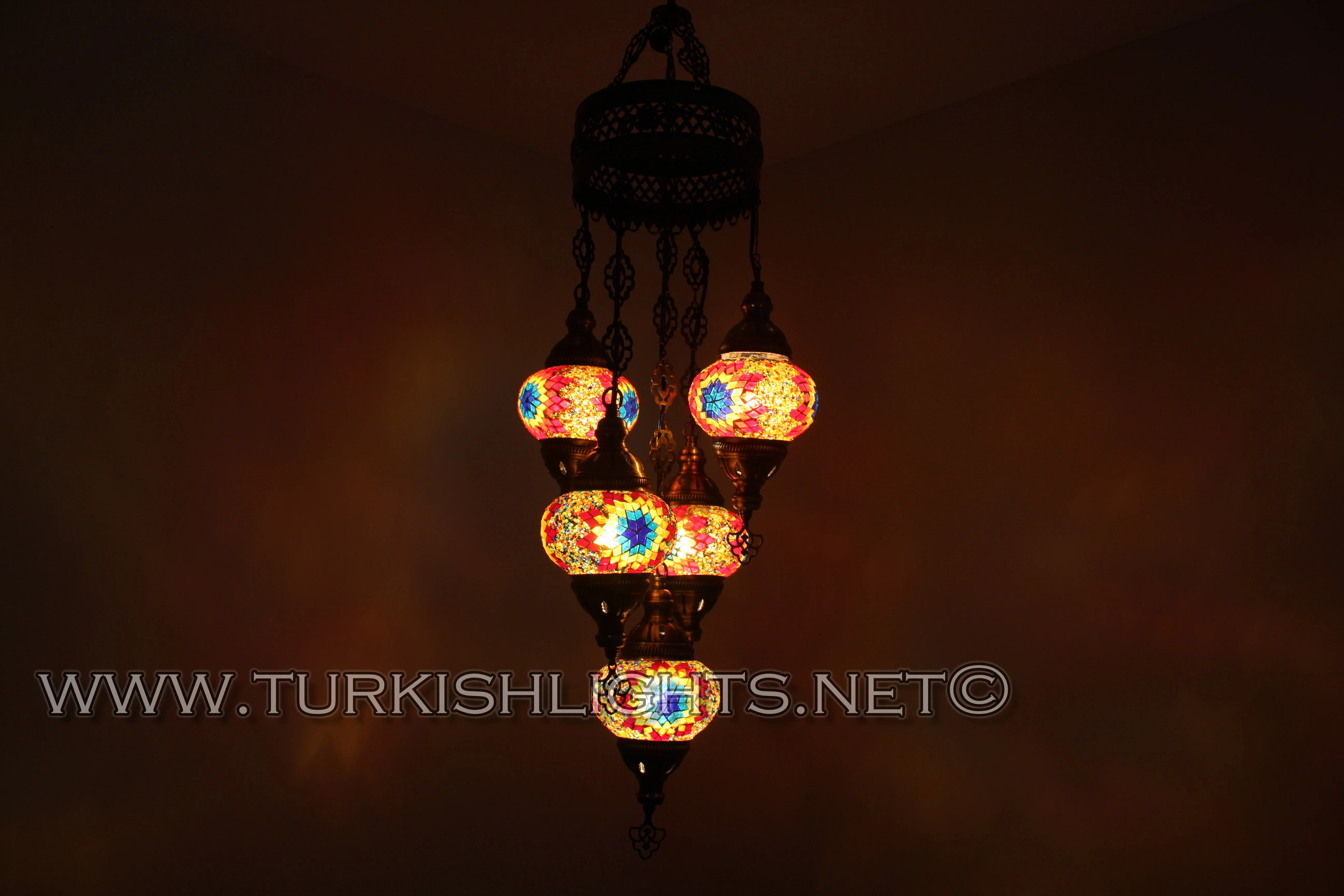 5 Ball Turkish Mosaic Chandelier - Handmade Sultan Design with Medium Globes, ID: S5M-13