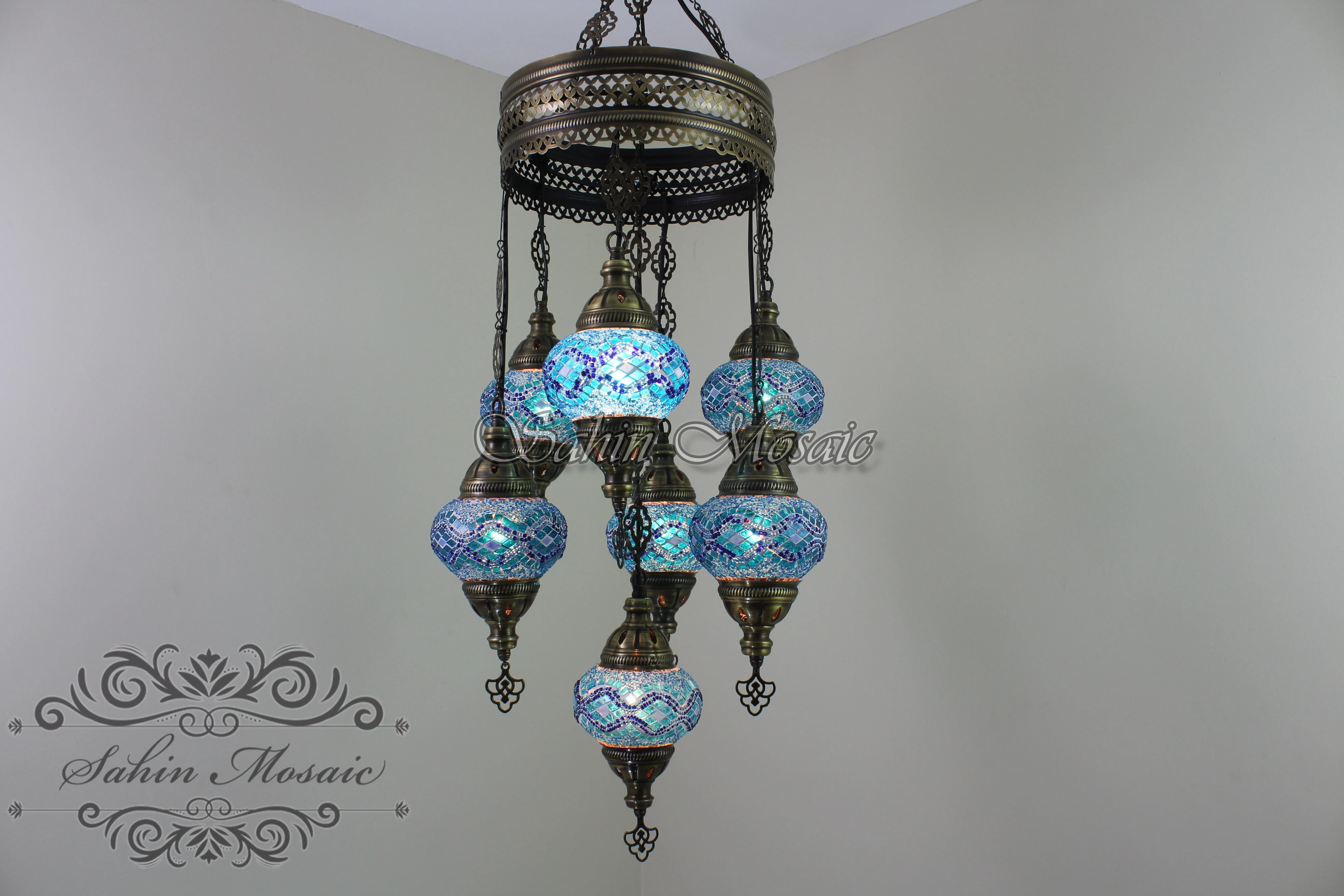 Experience the timeless elegance of Ottoman craftsmanship with this stunning 7-ball Turkish Sultan mosaic chandelier. Each piece is meticulously handmade by skilled Turkish artisans, featuring authentic mosaic glass globes in medium size.