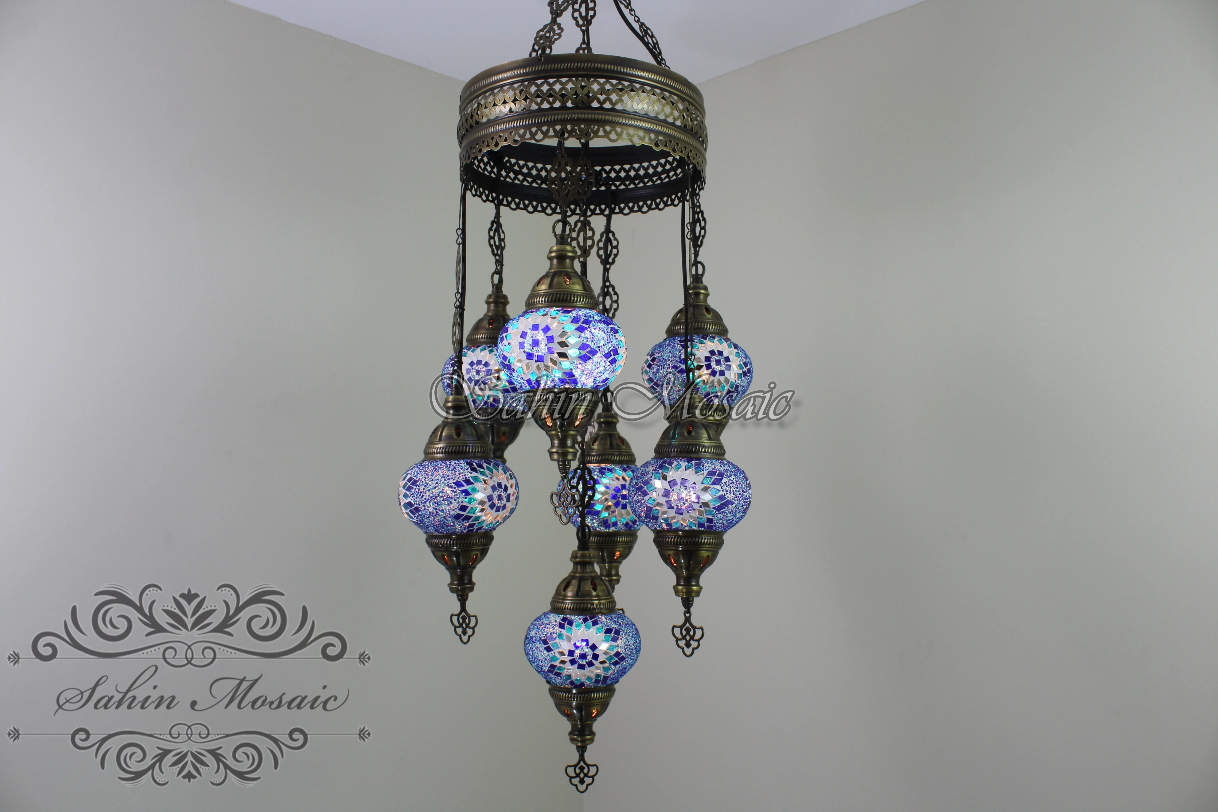 Experience the timeless elegance of Ottoman craftsmanship with this stunning 7-ball Turkish Sultan mosaic chandelier. Each piece is meticulously handmade by skilled Turkish artisans, featuring authentic mosaic glass globes in medium size.