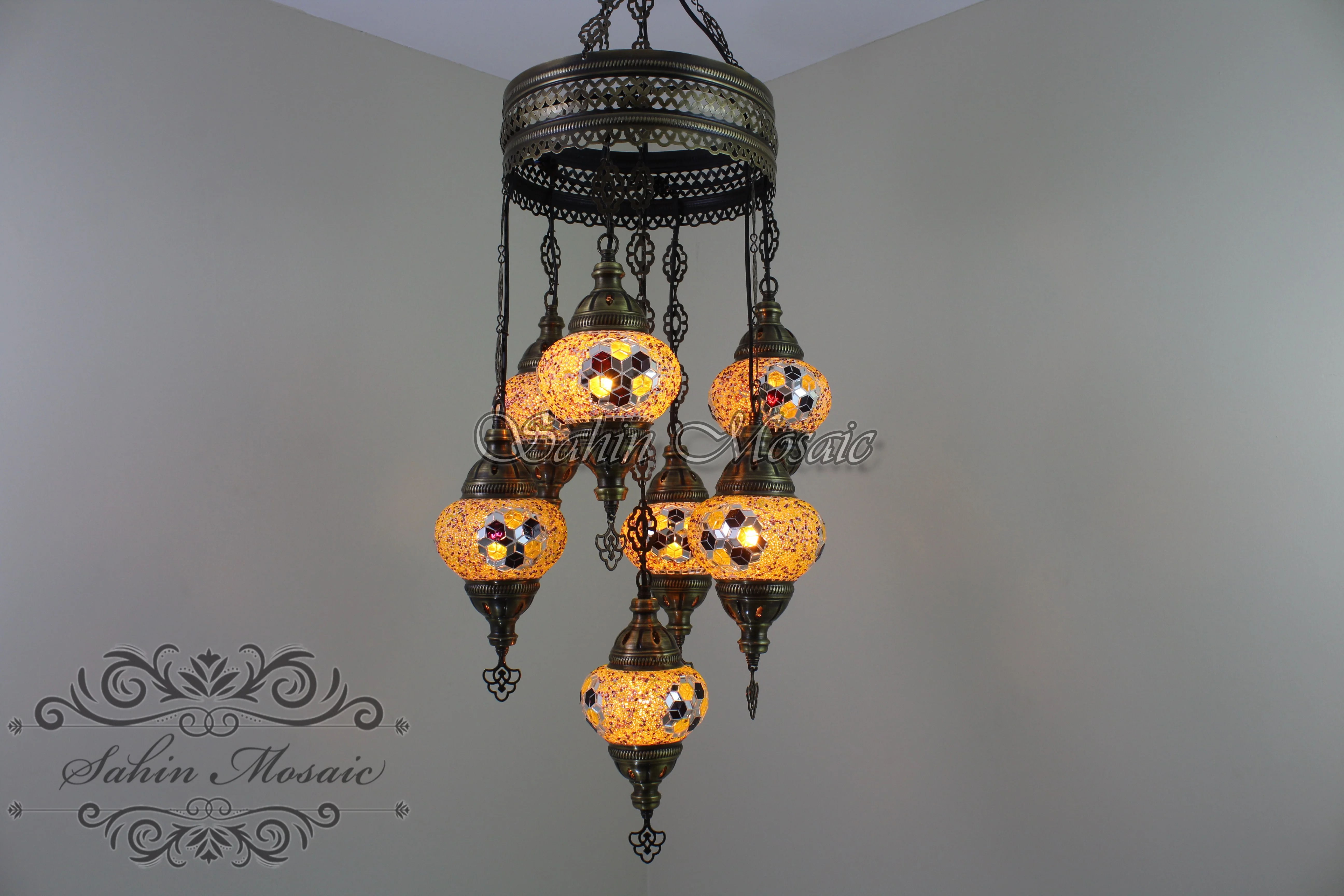 Experience the timeless elegance of Ottoman craftsmanship with this stunning 7-ball Turkish Sultan mosaic chandelier. Each piece is meticulously handmade by skilled Turkish artisans, featuring authentic mosaic glass globes in medium size.