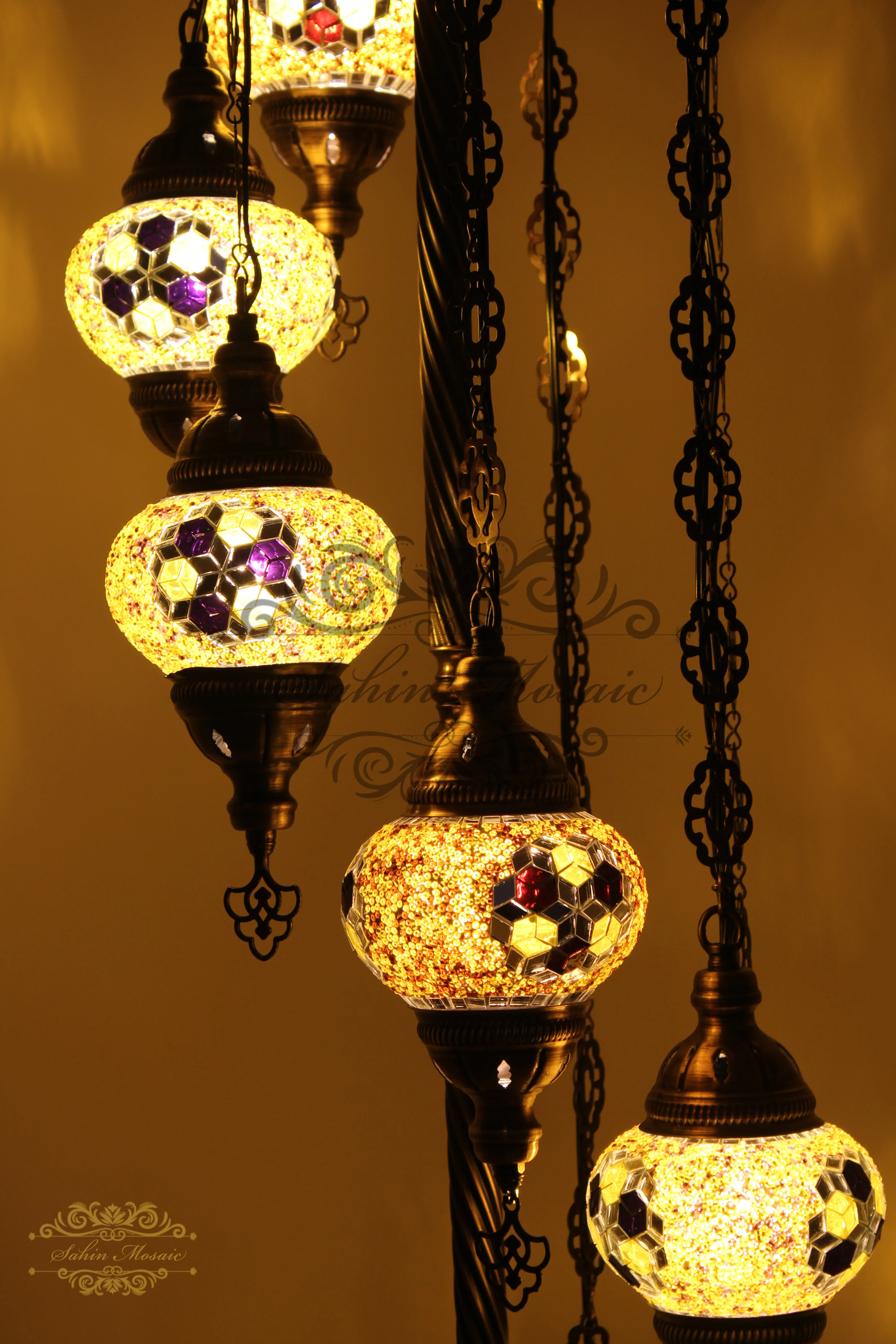 Spectacular Turkish Mosaic Floor Lamp - Illuminate your home with this breathtaking 7-globe floor lamp showcasing medium colorful mosaic globes. Each globe is handcrafted using traditional techniques that showcase the rich heritage of Turkish mosaic artistry.