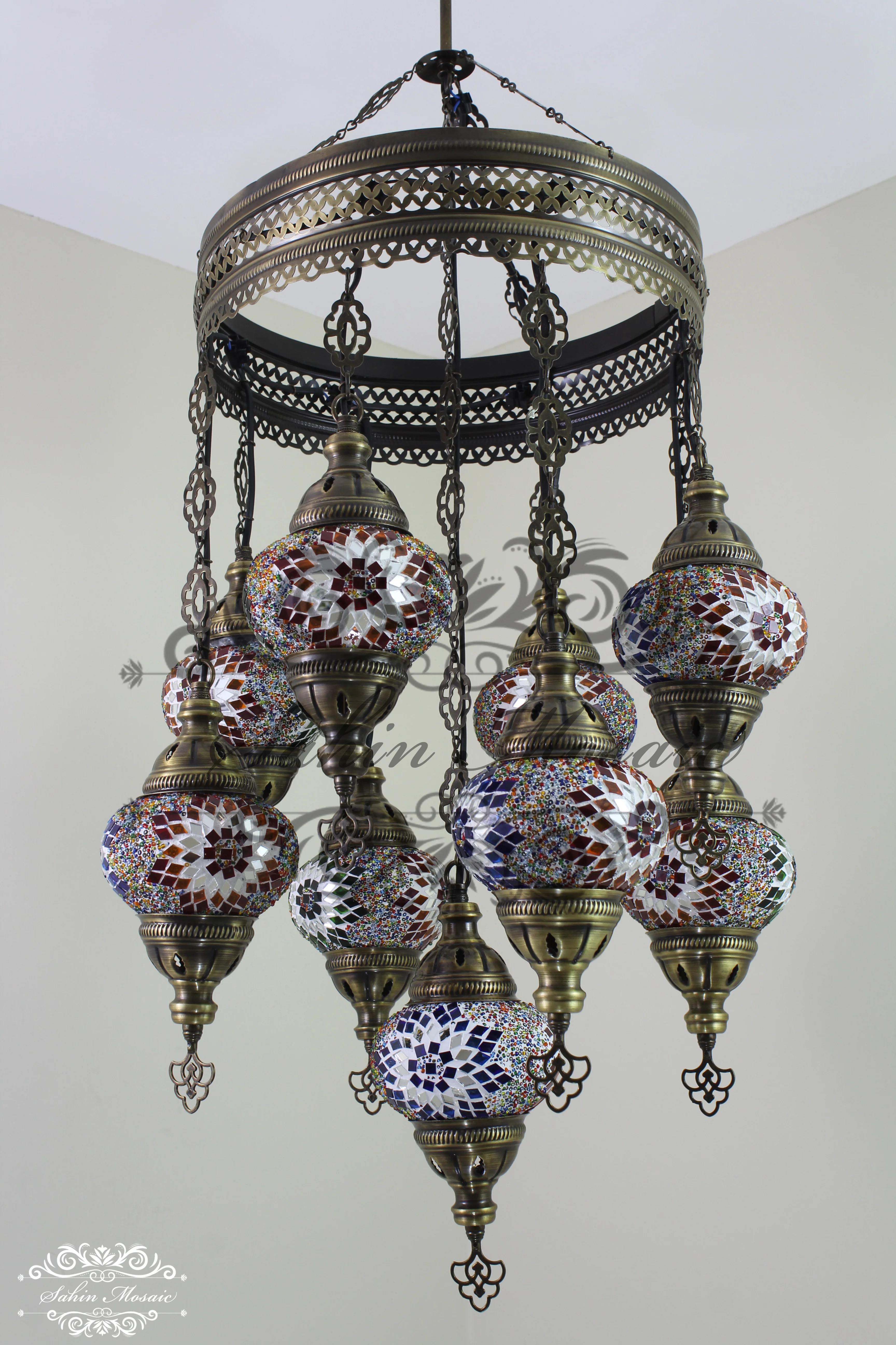 Transform your space with this stunning handmade Turkish mosaic chandelier featuring 9 beautifully crafted medium-sized globes. Each piece is a work of art, handcrafted in Istanbul using traditional mosaic techniques passed down through generations.
